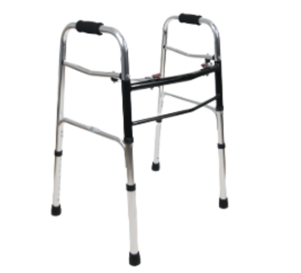 * EASY 2 BUTTON FOLDABLE SYSTEM * LIGHT WIEGHT * ADJUSTABLE HEIGHT *ALUMINIUM FIXED WALKER * DOUBLE CROSS BAR FOR EXTRA STRENGTH *BLACK SOFT SPONGE HANDLE *BLACK POWDER COATED FRAME